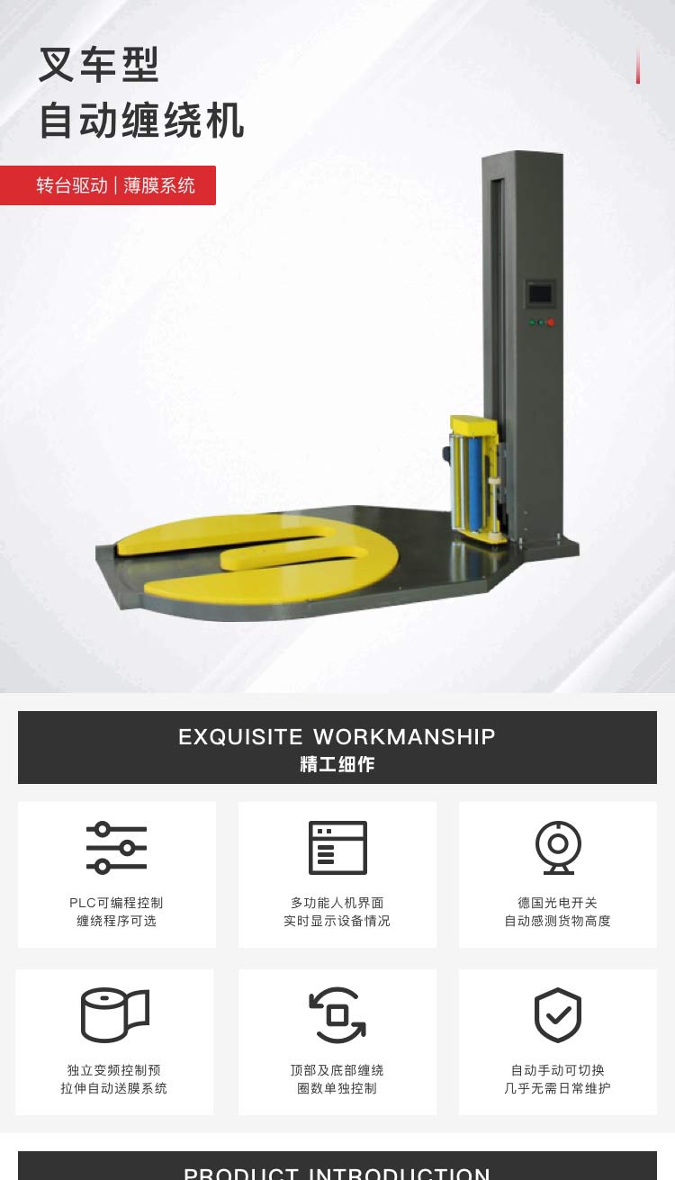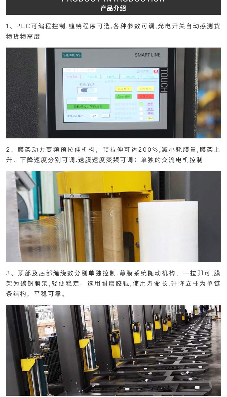 介紹:主要性能 PLC可編程控制,纏繞程序可選,各種參數(shù)可調(diào), 光電開關(guān)自動(dòng)感測(cè)貨物高度 預(yù)拉伸自動(dòng)送膜機(jī)構(gòu) 轉(zhuǎn)盤緩啟動(dòng)、緩?fù)V?,自?dòng)復(fù)位 頂部及底部纏繞數(shù)分別單獨(dú)控制 自動(dòng)、手動(dòng)可切換,幾乎無需日常維護(hù)