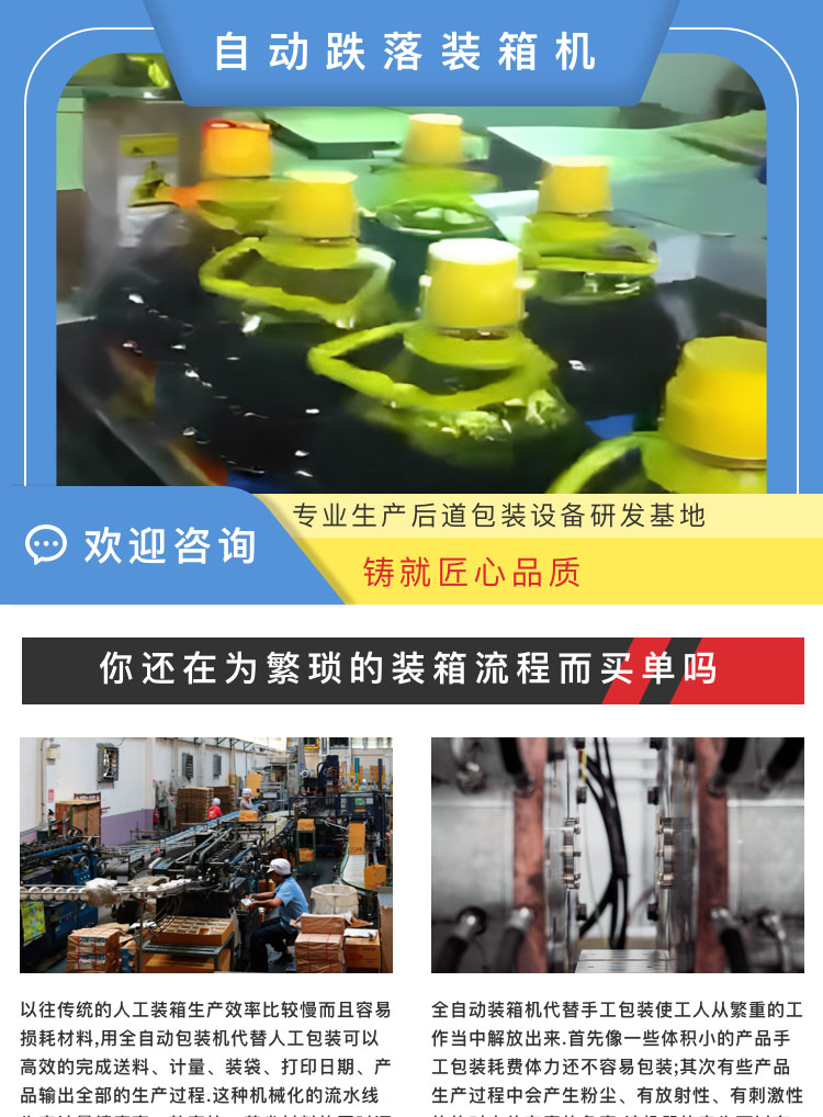 介紹:自動(dòng)跌落裝箱機(jī)。專(zhuān)業(yè)生產(chǎn)后道包裝設(shè)備研發(fā)基地鑄就匠心品質(zhì)。你還在為繁瑣的裝箱流程而買(mǎi)單嗎?以往傳統(tǒng)的人工裝箱生產(chǎn)效率比較慢而且容易損耗材料,用全自動(dòng)包裝機(jī)代替人工包裝可以的完成送料、計(jì)量、裝袋、打印日期、產(chǎn)品輸出全部的生產(chǎn)過(guò)程。這種機(jī)械化的流水線(xiàn)生產(chǎn)計(jì)量精度高、效率快、節(jié)省材料的同時(shí)還減少了人工成本。 全自動(dòng)裝箱機(jī)代替手工包裝使工人從繁重的工作當(dāng)中解放出來(lái)。像一些體積小的產(chǎn)品手工包裝耗費(fèi)體力還不容易包裝;其次有些產(chǎn)品生產(chǎn)過(guò)程中會(huì)產(chǎn)生粉塵、有放射性、有刺激性的的對(duì)人體有毒的危害。該機(jī)器的產(chǎn)生可以的解決這些問(wèn)題。 產(chǎn)品別稱(chēng):裝箱機(jī)、裝盒機(jī)、自動(dòng)裝箱機(jī)、自動(dòng)裝盒機(jī)、跌落式裝箱機(jī)、側(cè)推式裝箱機(jī)、抓舉式裝箱機(jī)、機(jī)器人裝箱機(jī)、一片式裹包機(jī)、食用油跌落式裝箱機(jī)。