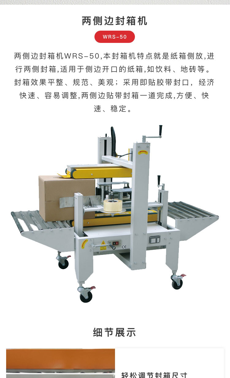 介紹:兩側(cè)邊封箱機(jī)WRS-50,本封箱機(jī)特點(diǎn)就是紙箱側(cè)放,進(jìn)行兩側(cè)封箱,適 用于側(cè)邊開口的紙箱,如飲料、地磚等。封箱效果平整、規(guī)范、美觀;采用 即貼膠帶封口,經(jīng)濟(jì)快速、容易調(diào)整,兩側(cè)邊貼帶封箱一道完成,方便、 快速、穩(wěn)定。 產(chǎn)品別稱:全自動(dòng)封箱機(jī)、工字封箱機(jī)、一字封箱機(jī)、十字封箱機(jī)、四角邊封箱機(jī)、上下驅(qū)動(dòng)封箱機(jī)、左右驅(qū)動(dòng)封箱機(jī)、快遞封箱機(jī)、電商封箱機(jī)、膠帶封箱機(jī)、快速封箱機(jī)、可調(diào)封箱機(jī)、伺服封箱機(jī)